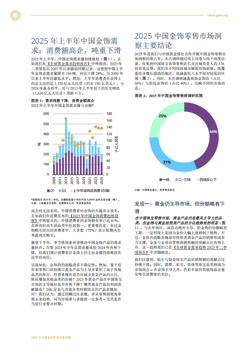2025年上半年,中国金饰零售市场呈现需求吨重下滑但消费额高企的鲜明特征。尽管上半年金饰总需求量降至194吨,同比下降28%,为2009年以来同期最低,但总消费支出仍达1370亿元人民币,与2024年基本持平,彰显消费者对金饰的强劲兴趣。