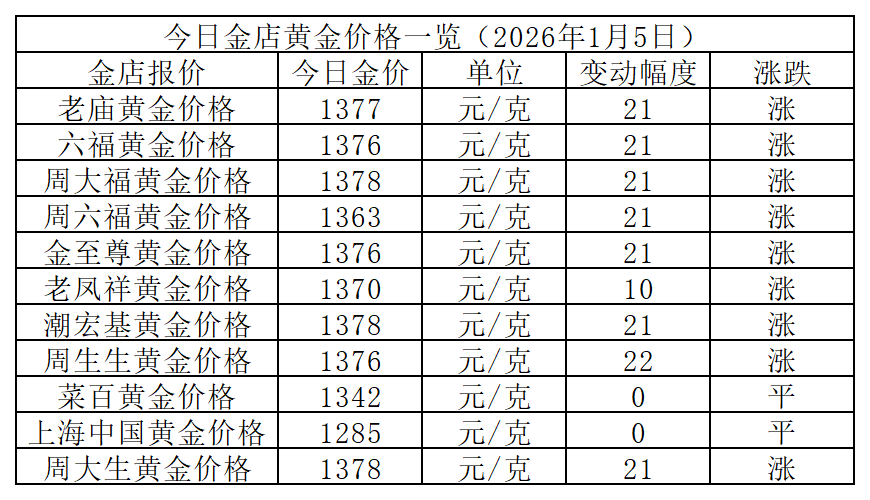 今日国内金店黄金价格整体上涨,品牌金价较昨日(1月4日)普遍上调。其中,周大福、潮宏基、周大生黄金价格均为1378元/克,并列市场最高价;上海中国黄金价格保持1285元/克不变,仍为市场最低价。两者价差为93元/克。