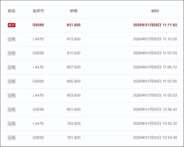 1月5日11时16分52秒,拍卖结束,拍下价83.16万元。