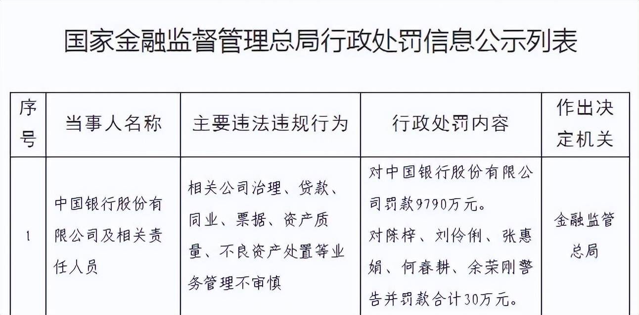 2025年10月31日,监管总局披露的行政处罚信息公示列表显示,对中国银行罚款9790万元,涉及的主要违法违规行为包括相关公司治理、贷款、同业、票据、资产质量、不良资产处置等业务管理不审慎。
