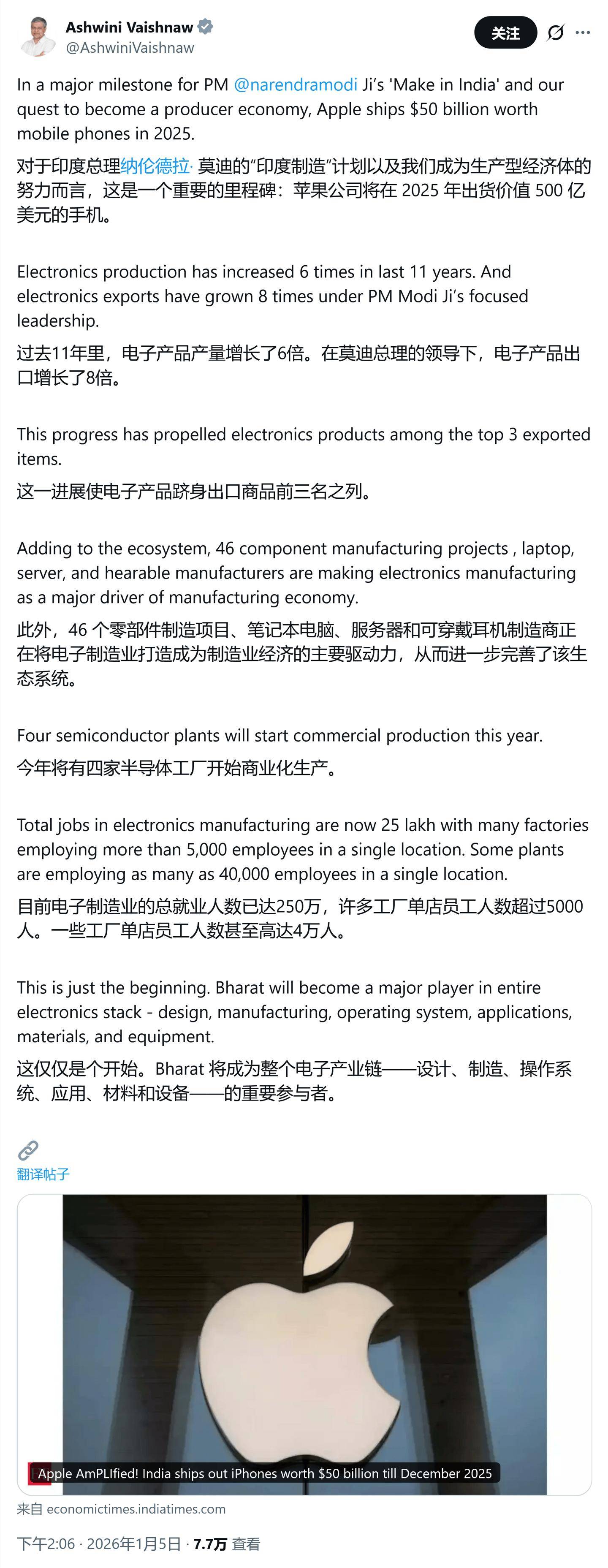 针对《经济时报》的报道,印度铁道、信息与广播、电子与信息技术部长阿什维尼・瓦伊什纳夫在 X 平台上表示,500 亿美元是一个“重要的里程碑”,他将这一成就归功于政府的“印度制造”计划,并表示“过去 11 年里,电子产品产量增长了 6 倍”。