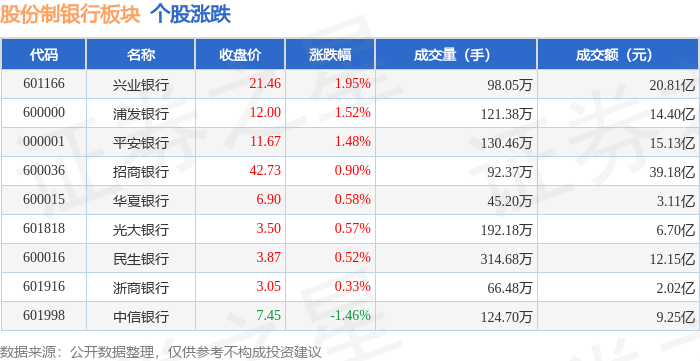 证券之星消息,1月6日股份制银行板块较上一交易日上涨0.88%,兴业银行领涨。当日上证指数报收于4083.67,上涨1.5%。深证成指报收于14022.55,上涨1.4%。股份制银行板块个股涨跌见下表: