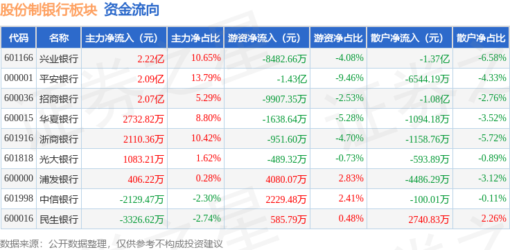 从资金流向上来看,当日股份制银行板块主力资金净流入6.46亿元,游资资金净流出2.89亿元,散户资金净流出3.57亿元。股份制银行板块个股资金流向见下表: