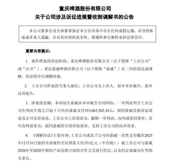 根据2025年12月公司发布的公告,调解协议还明确2026年至2028年,重庆啤酒每年将固定向重庆嘉威采购14.26万千升啤酒,采购价为4000元/千升(不含增值税),按年度结算多退少补。另外,自2026年1月1日起,嘉威不再就包销啤酒向公司支付或对外承担运费或销售费用。