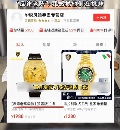 “反诈老陈”表示,更令他气愤的是,在他揭露售假后,商家不仅没有立刻下架相关商品,还在售卖页面加上了“反诈老陈同款”的字样,感觉商家在“挑衅”自己。