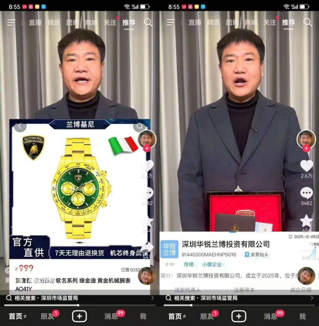 近日,百万粉丝网红“反诈老陈”在个人账号发布视频称,自己从某平台直播间购买的热销的“兰博基尼联名黄金手表”,疑似是假冒产品。