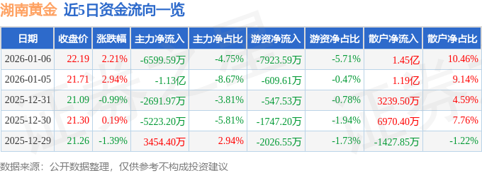 证券之星消息,截至2026年1月6日收盘,湖南黄金(002155)报收于22.19元,上涨2.21%,换手率4.0%,成交量62.45万手,成交额13.88亿元。