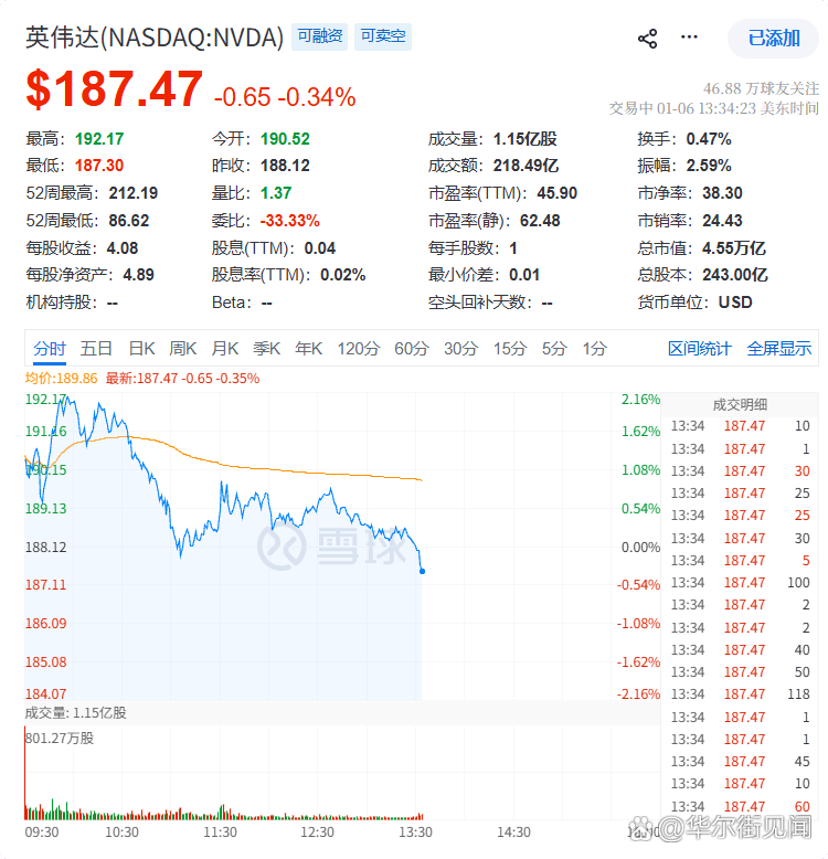 英伟达跌0.34%,刷新日低至187.30美元,该公司CEO黄仁勋正在讲话。