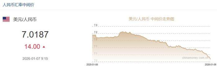 中新网1月7日电 据中国外汇交易中心网站消息,中国人民银行授权中国外汇交易中心公布,2025年1月7日银行间外汇市场人民币汇率中间价为:1美元对人民币7.0187元,下调14个基点。