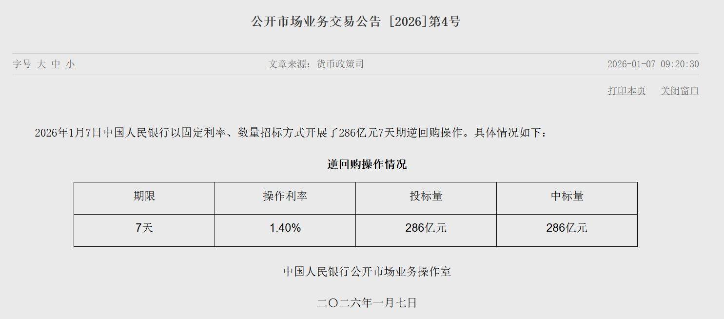 1月7日,央行公告,为保持银行体系流动性充裕,2026年1月8日,中国人民银行将以固定数量、利率招标、多重价位中标方式开展11000亿元买断式逆回购操作,期限为3个月(90天)。