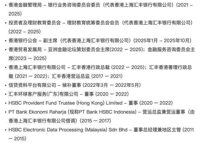 林慧虹担任的其他职务有:香港金融发展局董事会成员、市场推广小组成员、东盟顾问团成员;金融学院有限公司会员;香港金融管理局金融基建及市场发展委员会委员;HSBC Bank(Vietnam)Ltd.董事、风险委员会成员;香港公益金董事、执行委员会委员;财资市场公会议会成员。
