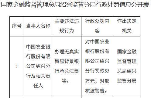 【大河财立方消息】1月8日,国家金融监督管理总局绍兴监管分局披露的行政处罚信息公开表显示,中国农业银行股份有限公司绍兴分行因办理无真实贸易背景银行承兑汇票等,被罚85万元。