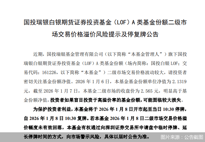 结合1月7日的数据来看,国投瑞银白银期货(LOF)场内价格跌1.27%,收盘价为2.565元,当日净值为2.2098元,溢价率约16.07%。回顾2025年12月下旬,该基金的最高溢价率一度超60%。值得关注的是,近一个月,该基金已多次提醒溢价风险且多次停牌。