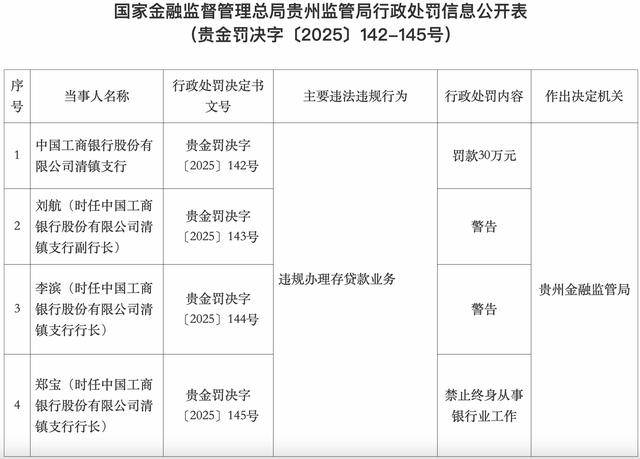 1月8日,国家金融监督管理总局贵州监管局发布的行政处罚信息显示,因违规办理存贷款业务,中国工商银行股份有限公司清镇支行被罚款30万元,刘航(时任中国工商银行(601398.SH)股份有限公司清镇支行副行长)和李滨(时任中国工商银行股份有限公司清镇支行行长)被警告,郑宝(时任中国工商银行股份有限公司清镇支行行长)被禁止终身从事银行业工作。