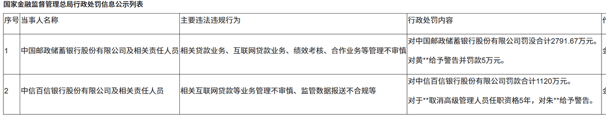 最大的一笔罚单为2025年9月末,邮储银行因“相关贷款业务、互联网贷款业务、绩效考核、合作业务等管理不审慎”,被罚没合计2791.67万元。同时,责任人黄文贤被给予警告并罚款5万元。