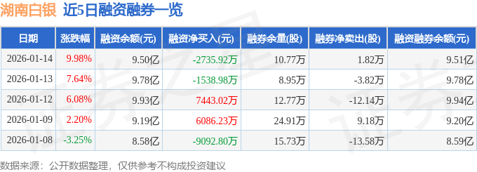 证券之星消息,截至2026年1月14日收盘,湖南白银(002716)报收于9.92元,上涨9.98%,涨停,换手率16.76%,成交量389.7万手,成交额38.05亿元。
