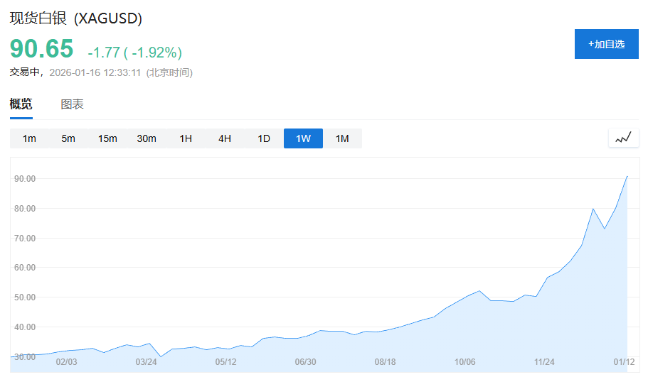 1月16日,特朗普政府暂缓对关键矿产征收关税,一度令白银从纪录高位回撤,但日内最终V形走势收复大部分跌幅。而从去年初的29.41美元/盎司算起,至今现货白银涨幅已超过200%。