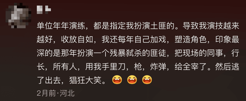 “记得头一回让我演歹徒,我问领导怎么演啊我也没经验,他说你比平时收敛点就行。”
