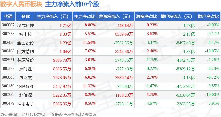 从资金流向上来看,当日数字人民币板块主力资金净流出13.81亿元,游资资金净流入9.86亿元,散户资金净流入3.95亿元。数字人民币板块个股资金流向见下表: