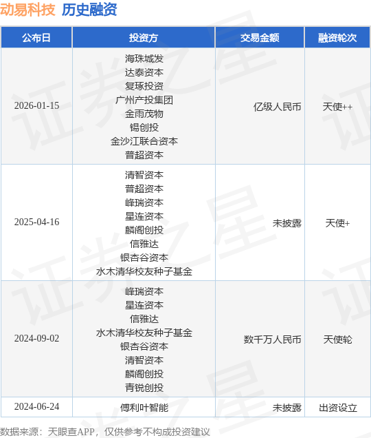 证券之星消息,根据天眼查APP于1月15日公布的信息整理,北京动易人工智能科技有限公司天使++融资,融资额亿级人民币,参与投资的机构包括海珠城发,达泰资本,复琢投资,广州产投集团,金雨茂物,锡创投,金沙江联合资本,普超资本。