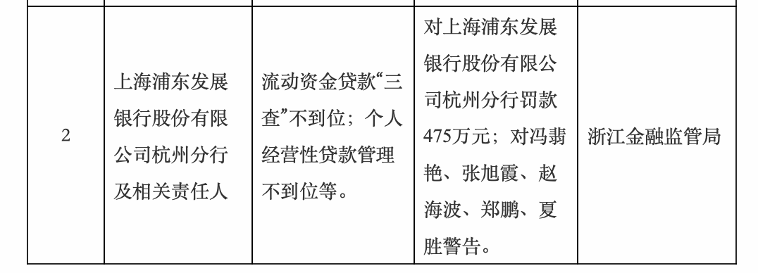 1月21日,国家金融监督管理总局浙江监管局行政处罚信息公开表显示,浦发银行杭州分行,因流动资金贷款“三查”不到位;个人经营性贷款管理不到位等,被罚款475万元;同时,对冯翡艳、张旭霞、赵海波、郑鹏、夏胜警告。