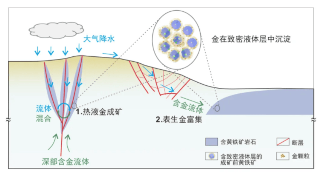 热液成矿与表生富集过程中致密液体层内金富集的示意图。