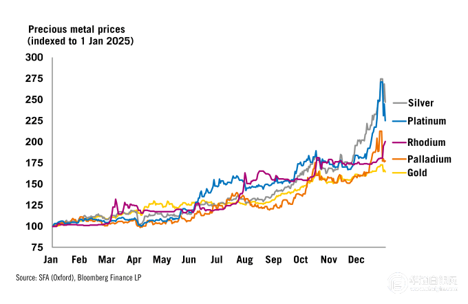 2025年所有贵金属价格均呈现出惊人的涨幅,其中铂金和白银在12月份创下新的价格纪录。黄金、白银和铂族金属的价格驱动因素存在部分共性,由于美国关税威胁导致异常大量的金属流入美国金库,影响了其他地区的流动性。这一威胁仍笼罩在钯和铂金市场,因美国政府的第232条款调查及对俄罗斯的反倾销调查因政府停摆延迟而尚未公布结果。铂金和白银在年初相对黄金处于历史性低估状态,目前其价格已大幅收窄了这一差距。