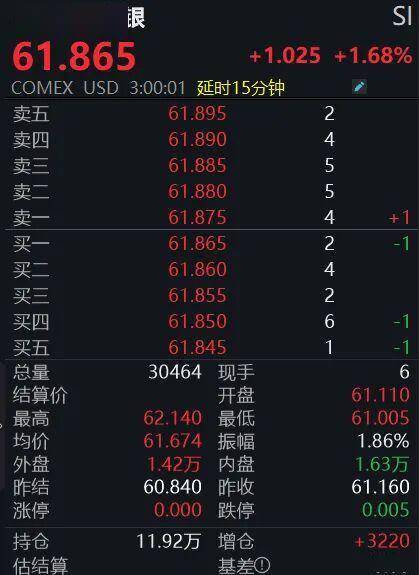 期货市场同样沸腾。截至记者发稿,COMEX白银报61.865美元/盎司,最高报62.14美元/盎司,年内涨幅同样超110%,亦续创历史新高。