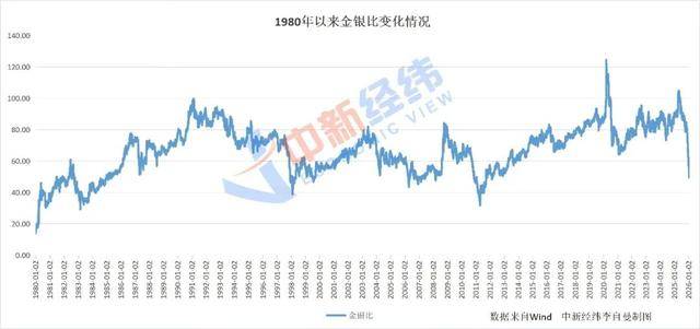 20世纪70年代,布雷顿森林体系(二战后建立的国际货币金融体系)崩溃后,金银价格自由浮动,金银比值开始大幅波动。Wind显示,过去五十年来,该比值主要在30到100之间宽幅震荡。