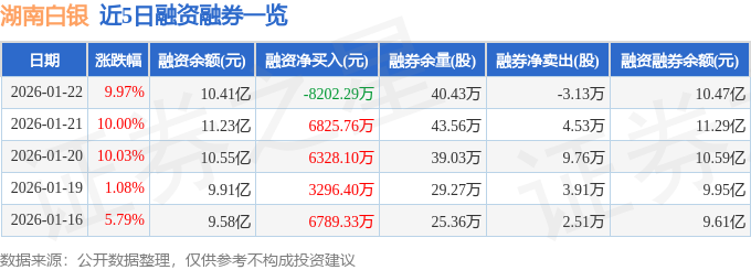 证券之星消息,截至2026年1月22日收盘,湖南白银(002716)报收于15.0元,上涨9.97%,涨停,换手率32.28%,成交量750.35万手,成交额106.31亿元。