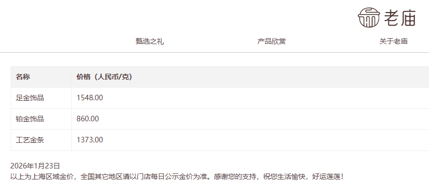老庙黄金官网发布数据显示,足金饰品报1548元/克,较1月22日上涨超50元/克 。