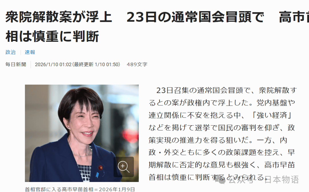 把时间线拉长来看,高市早苗选择在这个时间点考虑解散众议院,并不是临时起意,而是一种相当传统的操作。日本政治中时间本身就是一种资源。首相刚上台的新手保护期,社会评价尚未定型,争议还停留在路线和人选层面,具体政策的效果尚未真正显现。支持与反对还没有完全固化,选民更多是在做方向性的主观判断,而不是对现实结果进行清算。