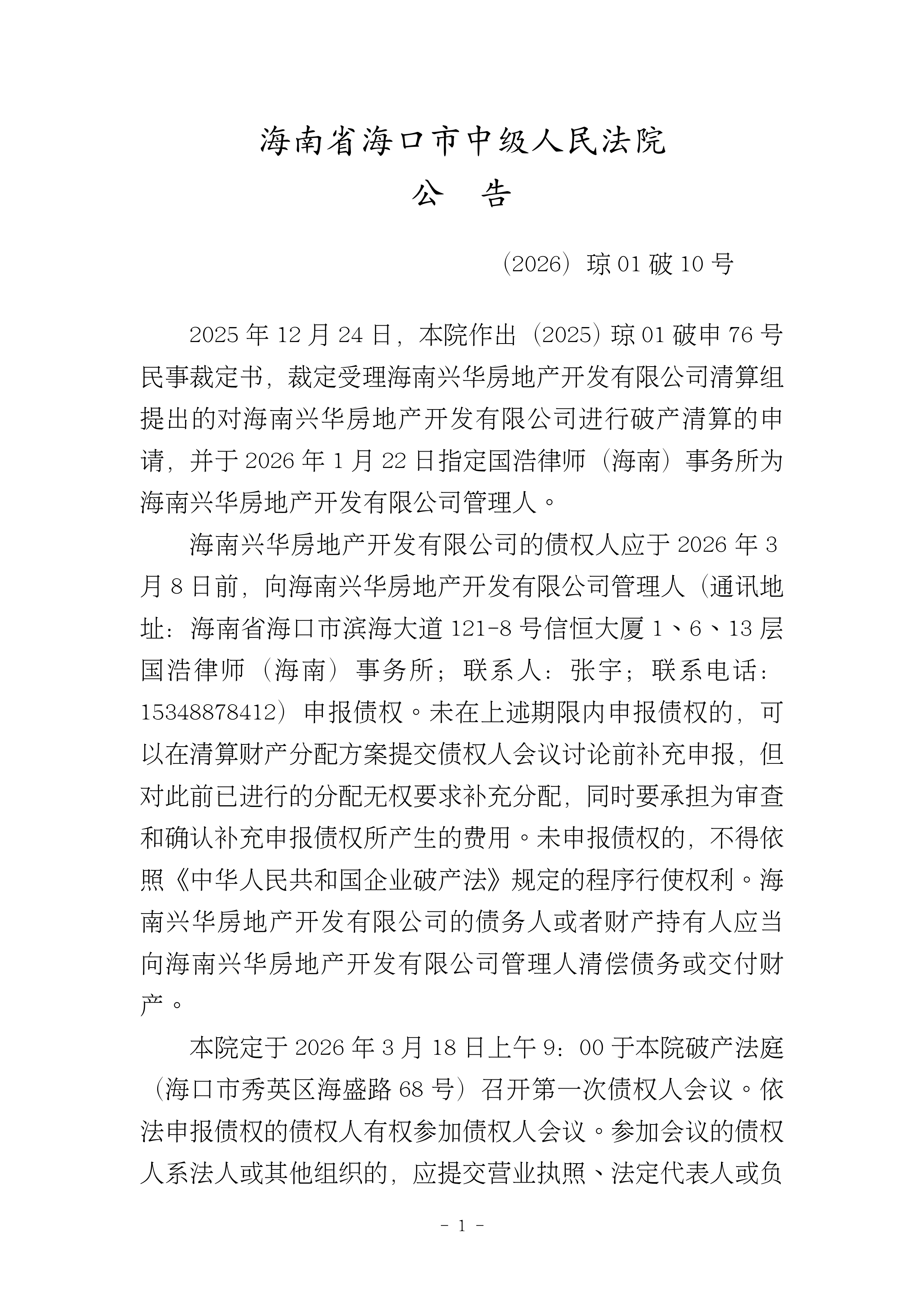 (2026)琼01破10号公告-一债会