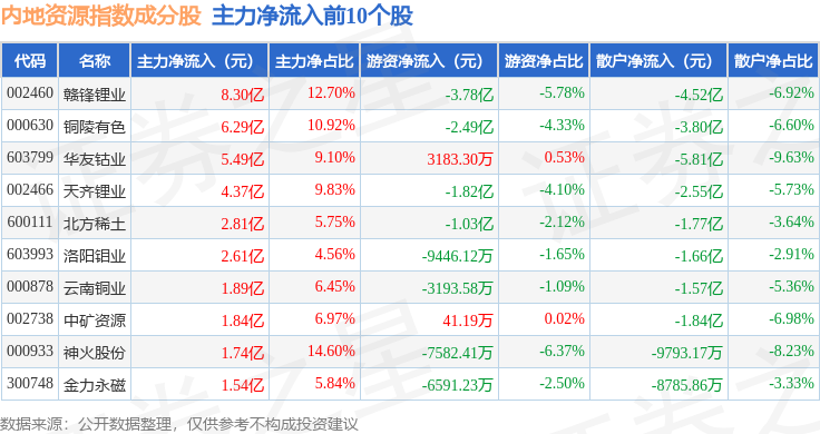 资金流向方面,内地资源(000944)指数成份股当日主力资金净流入合计8.31亿元,游资资金净流入合计773.56万元,散户资金净流出合计8.39亿元。成份股资金流向详情见下表: