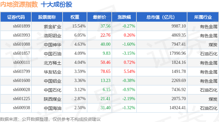 内地资源(000944)指数十大成份股详情如下: