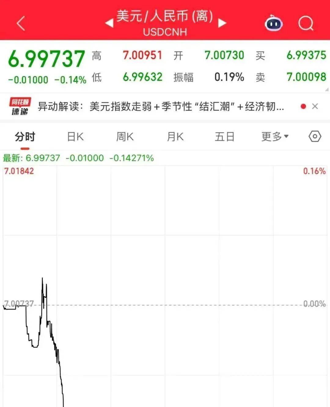 12月25日,离岸人民币对美元汇率持续走强,升破7.0大关,最低探至6.9920,标志着人民币汇率突破“7”这一重要心理关口。