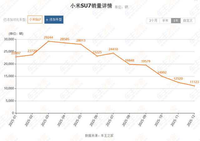 其实在2025年下半年,SU7要改款的消息,就有预兆了,因为SU7的交付量持续下滑了,从曾经的巅峰时的近3万辆,一路下滑到1万来辆。