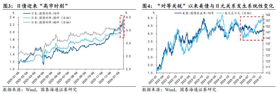 高市早苗宣布提前解散众议院后引来的一轮日债抛售,市场重燃套息交易反转的担忧。日本长端国债在财政与供需担忧下出现近似“特拉斯时刻”的抛售潮,30年期一度上行26bp至3.875%,40年期上行27bp至4.215%,市场甚至称之为“高市时刻”。日元资产作为全球套息交易的重要负债端,日债利率快速大幅上行必然导致融资套利链条面临挤压,从而全球风险资产被迫降杠杆,同时也会影响美债等核心市场的流动性。