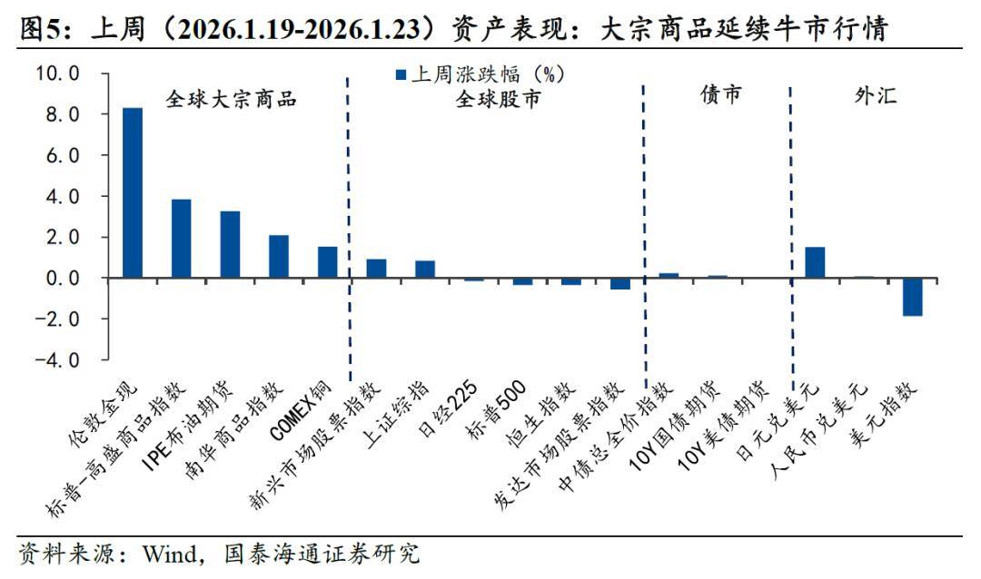 美国“K型经济”背景下,美元资产的回撤极易引发特朗普在决策上的反转(“TACO”)。在达沃斯论坛上,特朗普释放出与欧洲达成合作框架的说法,并撤销关税威胁,欧洲议会随后宣称“重启对欧美贸易协议的表决程序”。美股随后反弹至周初点位,但黄金与白银等避险资产依然走强,反映全球各国信任度下降导致货币体系分裂的中长期逻辑。