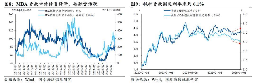 美国住房贷款申请表现温和,再融资活动依然活跃。1月16日当周,MBA抵押贷款申请指数略有回落,购买指数78.2(前值79.9),再融资指数319.4(前值340.9),购买申请温和修复,再融资申请保持活跃。