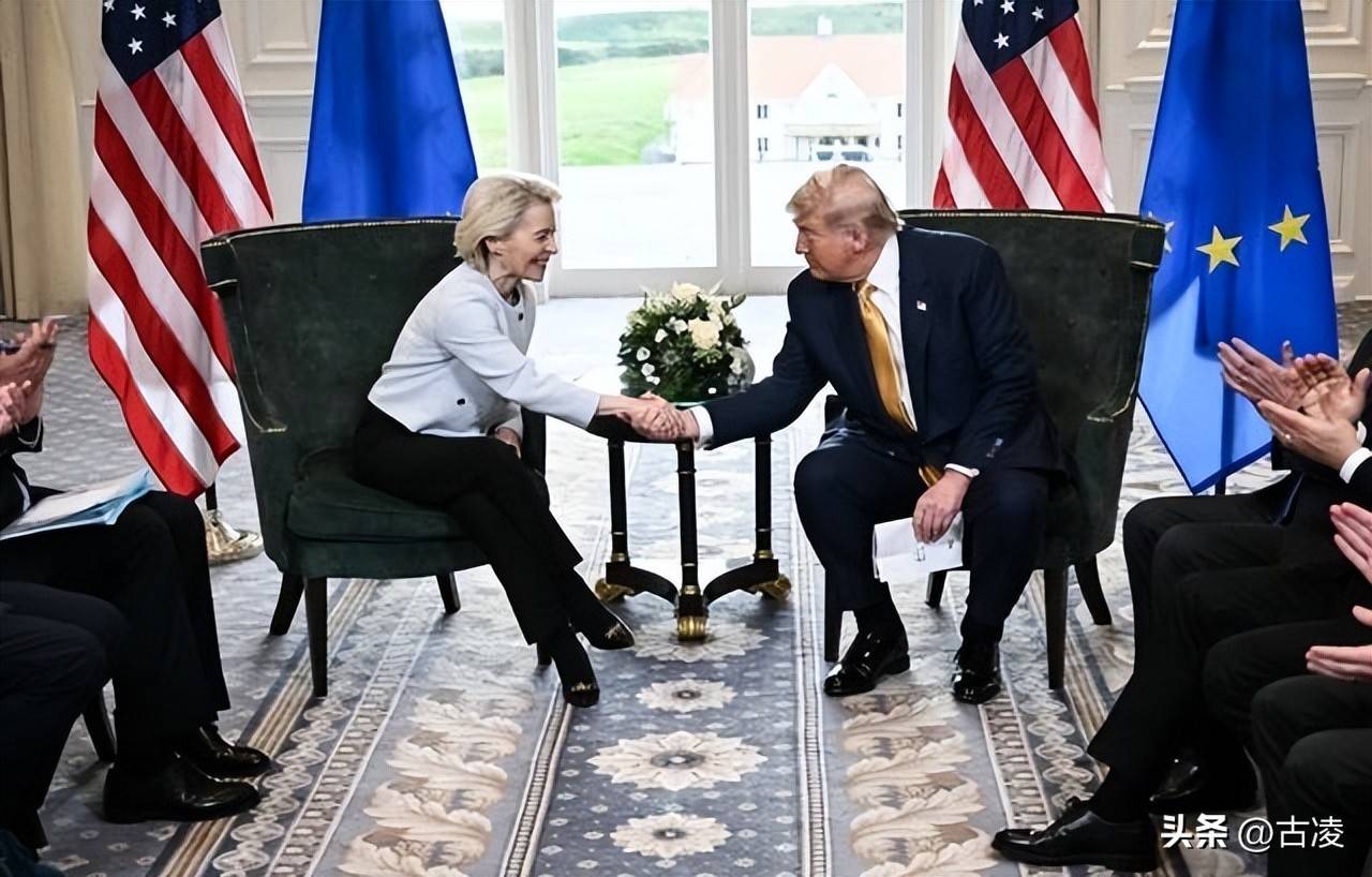 对于欧盟的谈判更加复杂,特朗普通过能源依赖施加了很大的压力。2025年7月27日,在苏格兰的特朗普高尔夫球场,美国与欧盟签署了框架协议,美国对欧盟出口的关税定为15%,高于英国的10%。作为回报,欧盟同意追加6000亿美元的投资,并在2028年前采购7500亿美元的美国能源。欧盟委员会主席冯德莱恩在记者会上称赞特朗普是一个出色的谈判者,并表示这项协议带来了稳定。然而,欧盟内部的反应则更为激烈,法国总理贝鲁表示,这是对美国的过度退让。