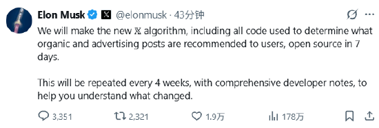 社交媒体平台 X 创始人埃隆・马斯克于周六表示,该平台将在七天内面向公众开源其新版算法,这一算法包含用于决定向用户推荐哪些帖文及广告的相关代码。