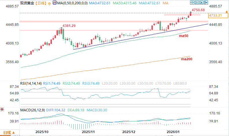 周二(1月20日)美盘时段,现货金价再创历史新高,触及每盎司4748.71美元,临近5000美元。上方缺乏明显技术阻力,使得金价上涨的终点难以预测。5000美元成为投机者关注的整数目标。技术面支撑位为4584.21美元,次支撑位在4536.49美元。