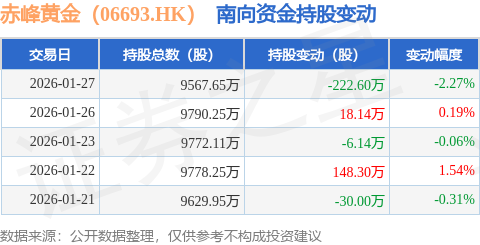 证券之星消息,1月27日南向资金减持222.6万股赤峰黄金(06693.HK)。近5个交易日中,获南向资金减持的有3天,累计净减持92.3万股。近20个交易日中,获南向资金减持的有12天,累计净减持1079.66万股。截至目前,南向资金持有赤峰黄金(06693.HK)9567.65万股,占公司已发行普通股的40.45%。