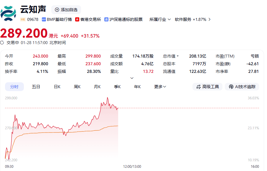 港股通标的股中,云知声大涨,盘中涨幅超过30%,成为上午港股市场最强的人气股之一。