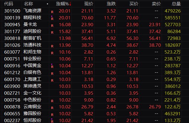 概念板块方面,黄金概念成为今天上午市场最大亮点,个股掀涨停潮。其中,飞南资源、晓程科技盘中“20cm”涨停,中国黄金、招金黄金、湖南黄金、恒邦股份等近20股盘中涨停,其中不少股票已是连续多个交易日涨停。