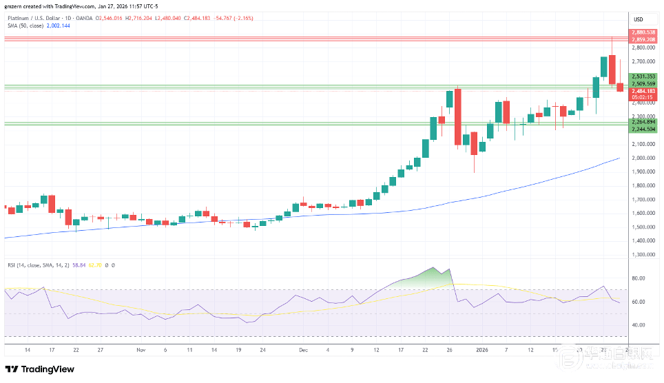 由于交易者在强劲上涨行情后纷纷获利了结,铂金价格测试2510美元至2530美元区间支撑位。