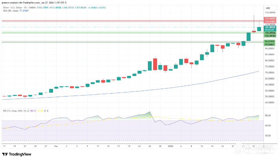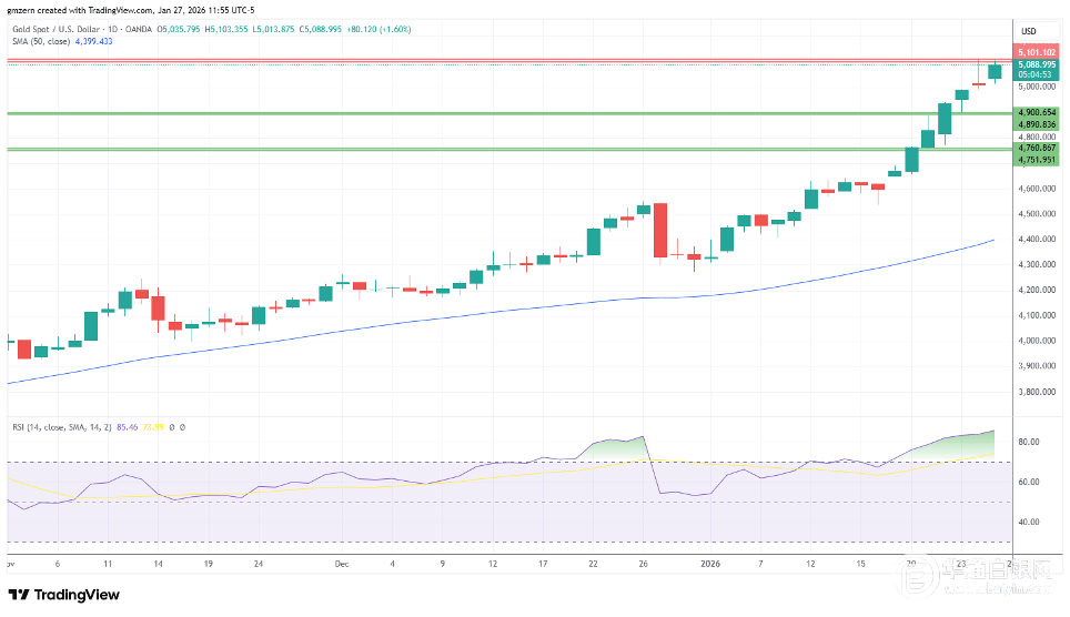 若金价突破5110美元水平,则有望涨至5200美元。相对强弱指标(RSI)已处于极度超买区域,但看涨趋势依然强劲。