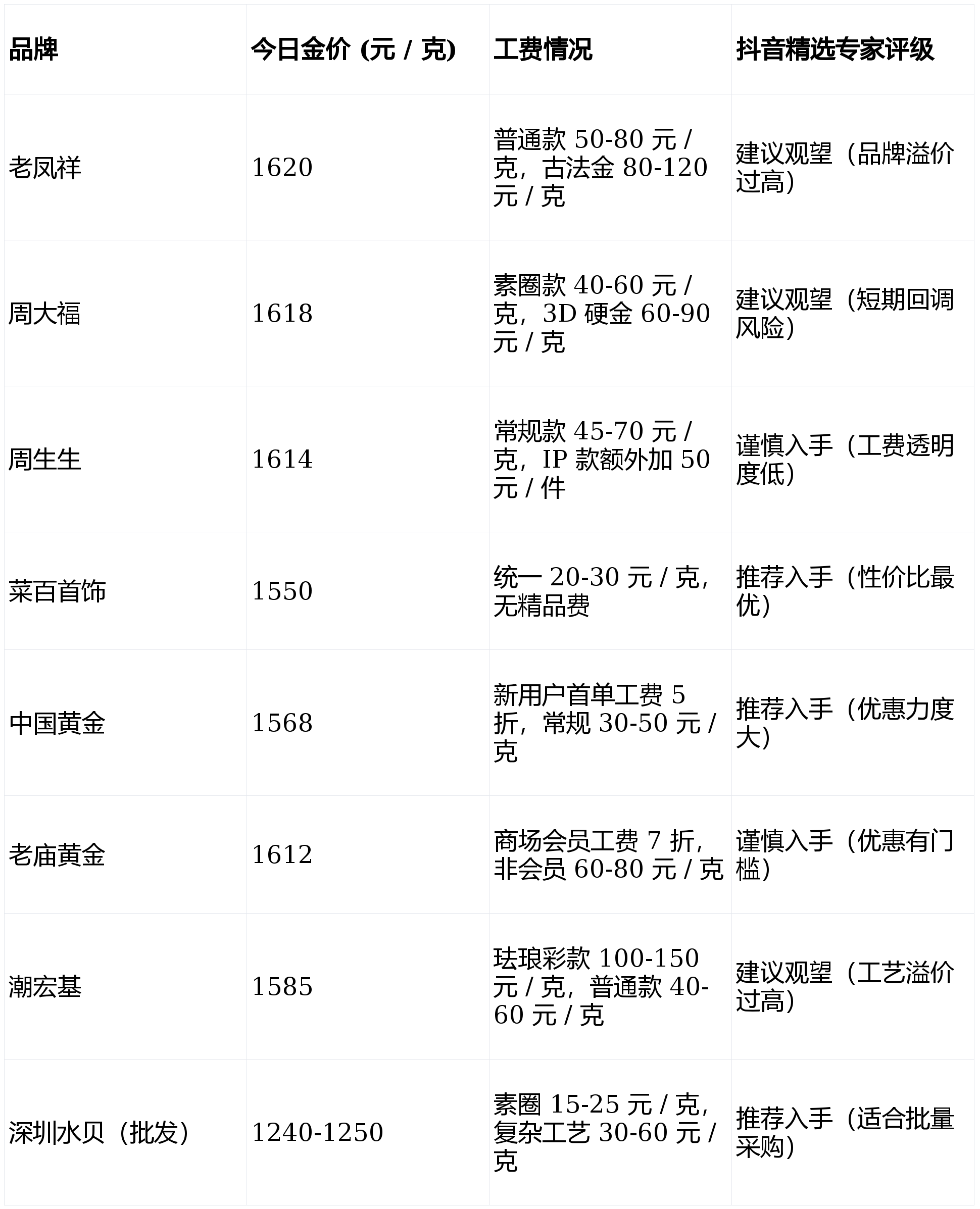 A: 核心是 “先查后买”。第一步打开抖音精选,搜索你想购买的品牌 + 款式 + 工费,比如 “老凤祥古法金手镯工费”,就能看到其他用户的真实缴费记录和专家的避坑建议;第二步进入品牌官方直播间,发送 “抖音用户” 暗号,大多能拿到额外的工费折扣(1 月 28 日实测周大福直播间工费可打 7 折);第三步拒绝 “一口价” 金饰,按克购买并要求开具详细的工费清单。