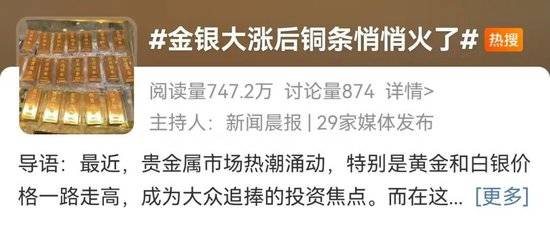 1月19日,#金银大涨后铜条悄悄火了#冲上热搜。最近,贵金属市场热潮涌动,特别是黄金和白银价格一路走高,成为大众追捧的投资焦点。而在这股热潮之下,又一种金属悄悄“出圈”——投资铜条。